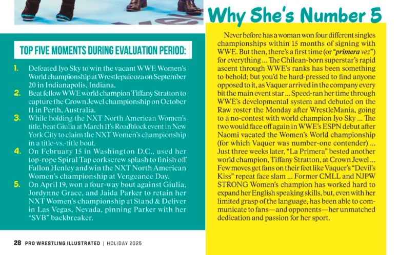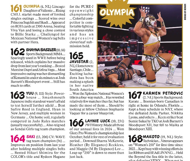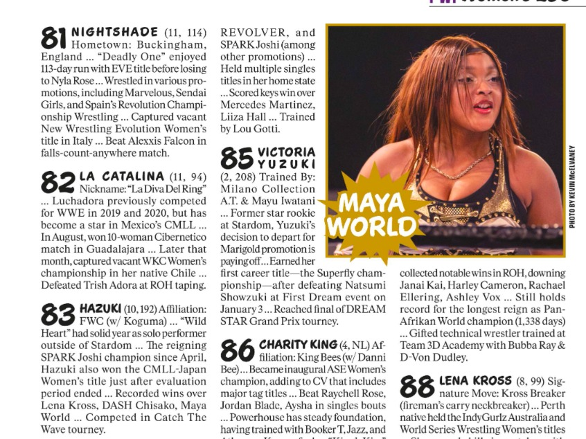Pro Wrestling Illustrated, una de las revistas más prestigiadas del wrestling mundial, ha publicado su edición de noviembre con el listado de -según sus criterios- las mejores 250 luchadoras del año y por primera vez tenemos tres chilenas en el ranking, lideradas por Stephanie Vaquer, en una lista que encabeza Mercedes Moné.