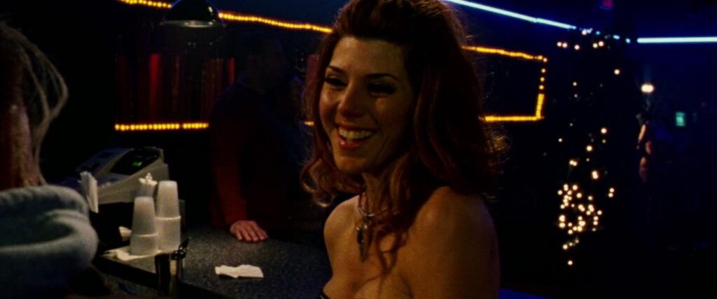 ¿Pero es la vida del protagonista miserable durante toda la duración de la pelicula? No, y son dos momentos exactos que poco tienen que ver con wrestling. Por un lado, luego de su infarto decide colgar las botas, reencontrarse con la hija que abandonó (recuerden EL abandono), vivir una vida más estable. Es genuina su felicidad al trabajar, al moverse, al interactuar con terceros, pero esa felicidad la destruye una sola palabra. Por otro lado, quien también lo hace feliz es Pam, quien sirve para varios paralelismos en la película: quienes viven a las sombras de una personalidad que no les pertenece, quienes no saben vivir sin soltar el pasado o, mi favorita, las formas de afrontar nuestros errores. El deseo amoroso de nuestro “héroe” que manda a la mierda todo lo que hacía feliz por una sola palabra: no. Él vuelve a la lucha libre como quien vuelve a una droga luego de un trauma presente, pero en este caso es solo un hombre versus una respuesta negativa. Sé que suena irreal y exagerado, pero los invito a verla por ustedes mismos: Randy es feliz hasta que alguien le dice que no.