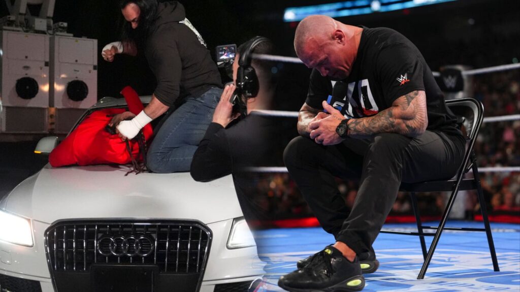 Mientras mostraban la llegada del músico Jelly Roll, vimos que un grupo de árbitros y productores corrían hacia un lugar. La cámara los siguió y llegó al lugar con dos vehículos chocados. Drew McIntyre habría colisionado a Jacob Fatu, lo sacó desde el parabrisas y lo atacó sin piedad.